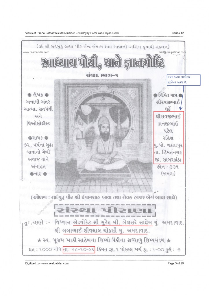 Update: 13-Jan-2017 – Changed links to archive.org 06-Jan-2012 || Jay Laxminarayan || || Jay Sanatan Dharm || || જય લક્ષ્મીનારાયણ || || જય સનાતન ધર્મ || A person who is… કરસન કાકાના ખાસ સાથીદારોમાંના એક… one of the close associates of Karsan Kaka… કચ્છ કડવા પાટીદાર જ્ઞાતિના… belonging to Kachchh Kadva Patidar community… સતપંથ ધર્મના સાહિત્યોના એક સાચા જાણકાર… having thorough knowledge of Satpanth literature… કરસન કાકાની સાથે અવિચલદસના કાર્યક્રમમાં હાજરી આપનાર… accompanied Karsan Kaka to attended Avichal Das’s function… કરસન કાકાને કોર્ટના કેસોમાં ખાસ મદદ કરનાર… helper of Karsan Kaka in court cases… પીરાણાની સંસ્થામાં સક્રિય કામ કરનાર… taking active participation in the affairs of Pirana’s institution… સતપંથ સમાજના હિત માટે ૪૦-૪૦ વર્ષથી પણ વધારેનો ખુબજ મોટો ફાળો આપનાર… devoting more than 40 years for the benefit of Satpanth… પાટીદાર સંદેશના તંત્રી શ્રી શામજીભાઈ જેની પ્રશંશા કરી હોય… go appreciated the editor of […]
