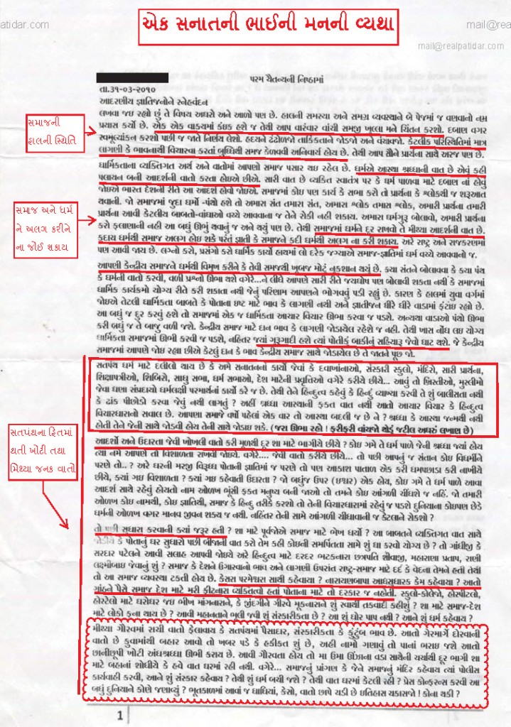 Update: 13-Jan-2017 – Changed links to archive.org 22-May-2010 This email is drafted in only in Gujarati language, because the contents of the attachment are in Gujarati and it was not possible for me to translate them into English. સમાજના ભાઈયો તથા બહેનો, હમણાં થોડા દિવસ પહેલાં મારા હાથ એક પેમ્પલેટ આવ્યું, જે આપડા સમાજના એક પ્રતિષ્ઠિત વ્યક્તિએ લખેલ છે. એ વ્યક્તિને કોર્ટના અને પોલીસના ખોટા કેસ થી થોડા દુર રાખવાના મારા પ્રયત્નમાં, એ વ્યક્તિની ઓળખ ન ખબર પડે એ માટે એમનું નામ અને ઓળખ પેમ્પલેટમાંથી કાઢી નાખેલ છે. અમુક લોકો કહે છે કે આપડે સાચા હોઈ તો આપડે કોનો ડર. એમની વાત સાચી છે. કોઈ કોનાથી ડરતું નથી. પણ પોતાનો બચાવ કરવો બહુ જરૂરી છે. આપણે ભલે ખબર હોય કે આપડે સછા છીએ અને કોઈ પણ સંજોગોમાં અપ્પડે જ વિજય થઈને બાહર આવશું, તોય પણ, તે માટે ખોટા ત્રાસ ને આમંત્રણ આપવું એ મૂર્ખાઈ છે, બહાદુરી નહીં. આપડે જયારે બઝારમાં નીકળ્યા […]