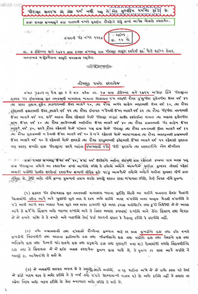 Update: 13-Jan-2017 – Changed links to archive.org 15-May-2010 Dear All, Attached is a copy of agreement entered into between KAKA Ramji Laxman & Heirs of Saiyyed Imam Shah Bawa. કાકા રામજી લક્ષ્મણ તથા સૈયદ ઈમામ શાહ બાવાના વન્સજો વચ્ચે થયેલ કરારની નકલ આ સાથે જોડેલ છે. This agreement is entered into on 17 Dec 1925. આ કરાર તા. ૧૭-૧૨-૧૯૨૫ ના કરવામાં આવેલ છે. This agreement pertains towards the terms and conditions of appointment of Kaka and administration of the Pirana shrine. આ કરારમા કાકાની નિમણુંક અને વહીવટી શરતોનો ઉલ્લેખ છે. https://archive.org/details/Series10-PiranaSatpanthKakaAppointmentAndAdminRightsAgreement Courtesy: Copy of this agreement has been forwarded to me one of the email recipients. આભાર: આ કરારની કોપી મને મારા email વાંચનાર એક વ્યક્તિએ મોકલાવેલ છે. Real Patidar Download / Print / View full article, attachments [Best Option]: http://www.box.net/shared/aa1qz40yqh
