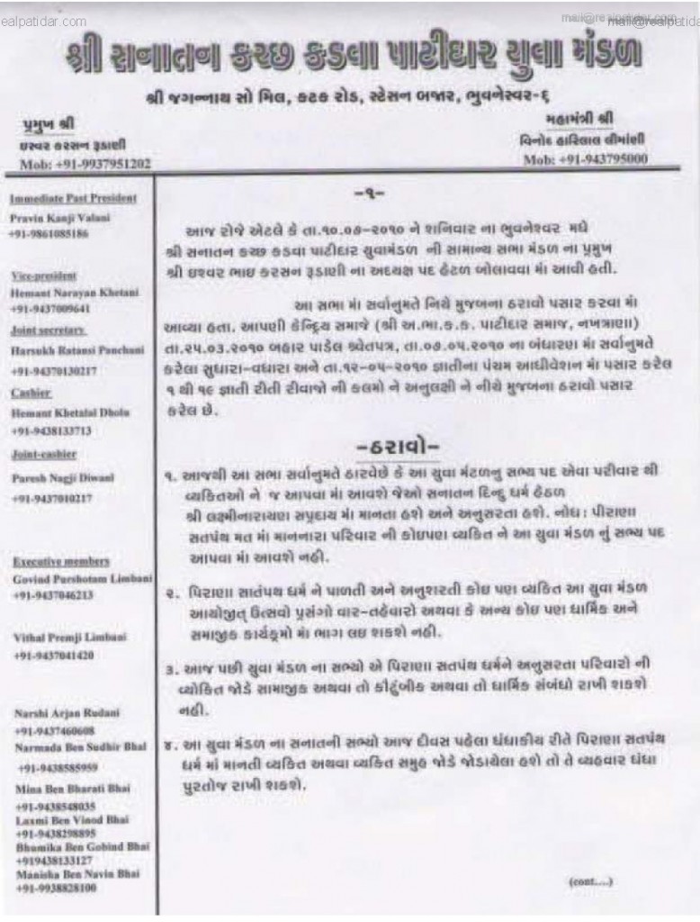 11-Jul-2010 સર્વે જ્ઞાતિજનો, તા. ૧૦-૦૭-૨૦૧૦ ના બોલવામાં આવેલી સભામાં, સર્વાનુમતે, ભુવનેશ્વર યુવક મંડળએ, ઐતિહાસિક ઠરાવો પાસ કર્યા; મુખ્ય ઠરાવો: ૧. સતપંથ પરિવારના વ્યક્તિઓ યુવક મંડળના સભ્ય નહિ બની શકે. ૨. પીરાણા સતપંથ ધર્મને પાળતી કોઈ પણ વ્યક્તિ યુવા મંડળ આયોજિત પ્રસંગોમાં ભાગ લઇ શકશે નહીં. ૩. પીરાણા સતપંથ ધર્મને પાળતા વ્યક્તિઓ સાથે કૌટુંબિક તથા ધાર્મિક સંબંધો રાખવા નહીં. ઠરાવોની નકલ આ email સાથે જોડેલી છે. તે સાથે આ લીંક પર પણ વાંચી શકશો (Updated 2017-01-14: https://archive.org/details/OE011) પ્રમુખ ઈશ્વરભાઈ તથા ભુવાનેષર યુવક મંડળને આપડા સર્વે જ્ઞાતિ તરફથી અભિનંદન અને આભાર. લી. ખરો પાટીદાર Download / Print / View full article, attachments [Best Option]: http://www.box.net/shared/zs88b1s72d https://archive.org/details/OE011