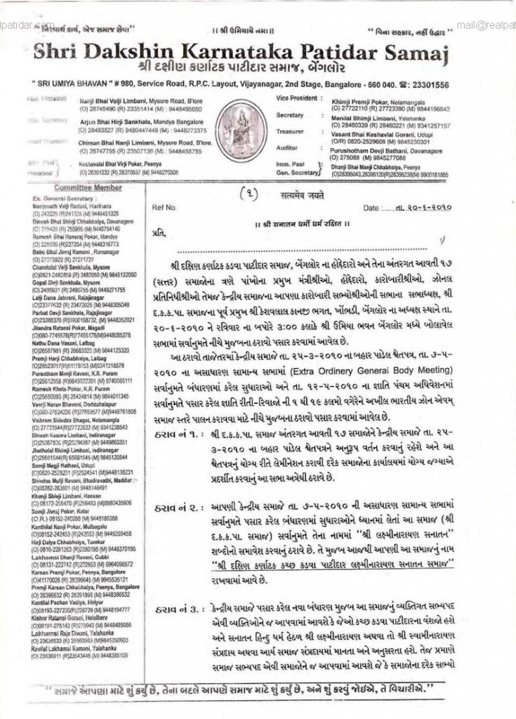 29-Jun-2010 Dear All, Here is an another example of implementation of clause 18 of Gnati Reet Rivaj rules જ્ઞાતિ રીત રીવાજ નિયમના કલમ ૧૮ નું ચુસ્ત રીતે પાલન નું વધુ એક દાખલો. Dakshin Karnataka Zone (Dakshin Karnataka Patidar Samaj) of our samaj, which consists of 17 samaj, have unanimously passed resolutions which have very wide impact and are truly historic. Copy of the resolutions is attached here. આપડી સમાજનું, દક્ષિણ કર્નાટક ઝોન (દક્ષિણ કર્નાટક પાટીદાર સમાજ), જેમાં ૧૭ સમાજોનું સમાવેશ થાય છે, તે ઝોન માં સર્વાનુમતે, ઐતિહાસિક નિર્ણયો (ઠરાવો) લીધા છે. આવા નિર્ણયો, અન્ય સમજો માટે એક મોટો અને સાચા અર્થ માં દાખલો છે. આ નિર્ણયોની કોપી આ ઈ-મેલ સાથે જોડેલી છે. The name of the zone is changed to “Dakshin Karnataka Kutch Kadva Patidar Laxminarayan Sanatan Samaj” ઝોન નું નામ બદલીને “દક્ષિણ કર્નાટક કચ્છ કડવા પાટીદાર લક્ષ્મીનારાયણ સનાતન સમાજ” રાખવામાં આવેલ છે. This zone has set an example for all zones and samajs to follow, on how the clause […]