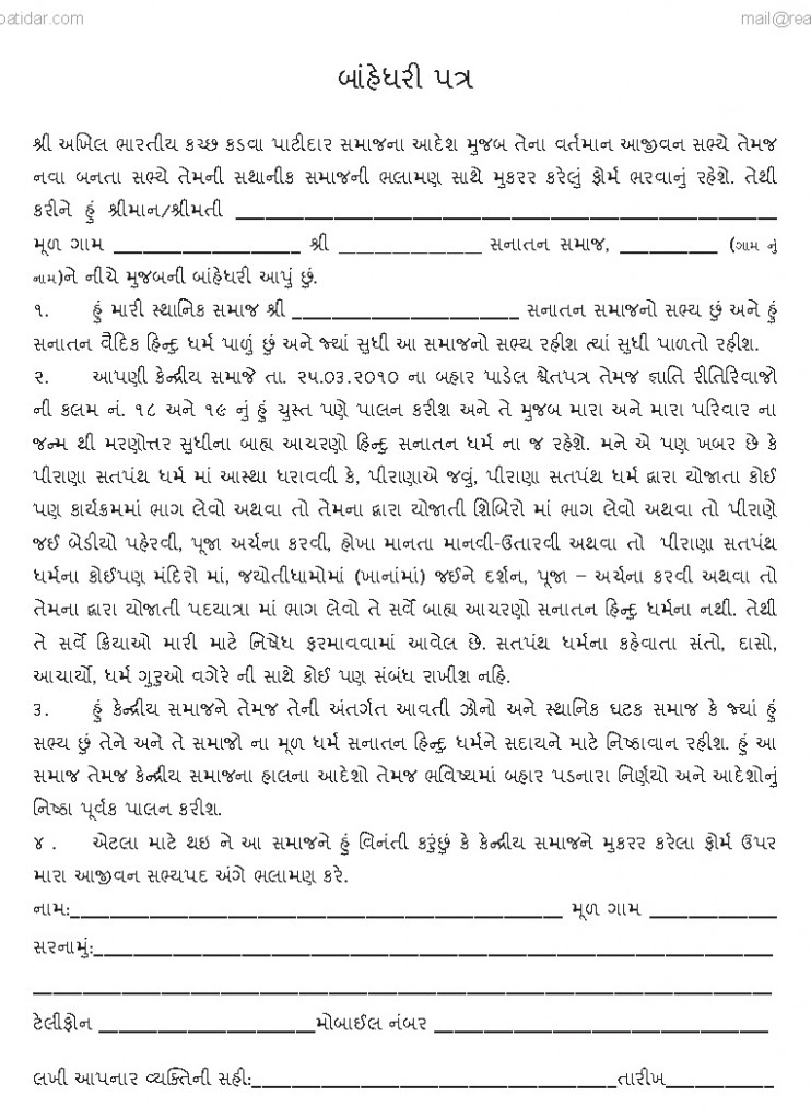 15-Sep-2010 || જય લક્ષ્મીનારાયણ || કેન્દ્રીય સમાજ ના આદેશ મુજબ કચ્છ અને કચ્છ બહાર ના નાના મોટા સમાજોમાં ઘણા લોકો સતપંથ ધર્મ ને ત્યાગીને સનાતન ધર્મ સ્વીકારવા લાગ્યા છે. As per the order of the Central Samaj (ABKKP Samaj), local samajs in Kuchchh and outside Kuchchh have seen that many people have quit Satpanth dharm and are joining Sanatan Dharm. ત્યારે એવી માંગ સામે આવી રહી છે કે આવા લોકો પાસે થી કેવી રીતે બહેન્દરી (લેખિત માં) લેવી. Under such circumstances, people felt the need to know what kind of assurance should be taken from the incoming people. એટલા માટે એક આદર્શ બહેન્દરી પત્ર (Model Undertaking Letter) આ ઈમૈલ સાથે જોડું છું. સ્થાનિક સમાજો, સતપંથ ધર્મ ત્યાગીને સનાતન ધર્મ અપનાવનાર લોકો/પરિવારો પાસેથી આ આદર્શ બહેન્દરી પત્ર પ્રમાણે આવનાર લોકો પાસેથી બહેન્દરી લઈ શકે છે. Accordingly a Model Undertaking Letter is attached this email which can be used the local samaj’s to take undertaking from the people who […]