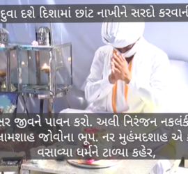 Date: 11-Feb-2020 Satpanth Ghat Paat Pooja (prayer) ritual is being performed a follower (mukhi) of Satpanth. Each section of pooja (prayer) starts this Kalma: “ॐ ફરમાનજી બિસ્મિલ્લાહ હર રહેમાન….”“Om Farmanji Bismillah Har Raheman…” and ends “હકલા એલાહ ઈલ્લલાહો મુહંમદુર રસુલીલાહે”“Hak Lahe Illillaho Muhmmadur Rasulillah” https://archive.org/details/series78 YouTube: https://youtu.be/VO6dnMFFRRc During the prayers names of Murtaza Maula Ali and his descendants to the throne (who generally are pirs) are recited. Prayers are basically of three types: Recital of names of descendants of Murtaza Maula Ali, who are generally the Pirs of Satpanth Praising of Ali and his descendants upto Nishkalanki Narayan Asking for forgiveness and blessings and requesting the fulfillment of desires. For complete information see the video above. Real Patidar