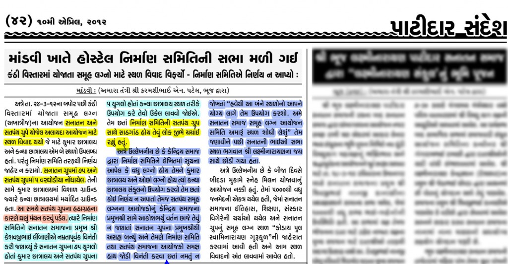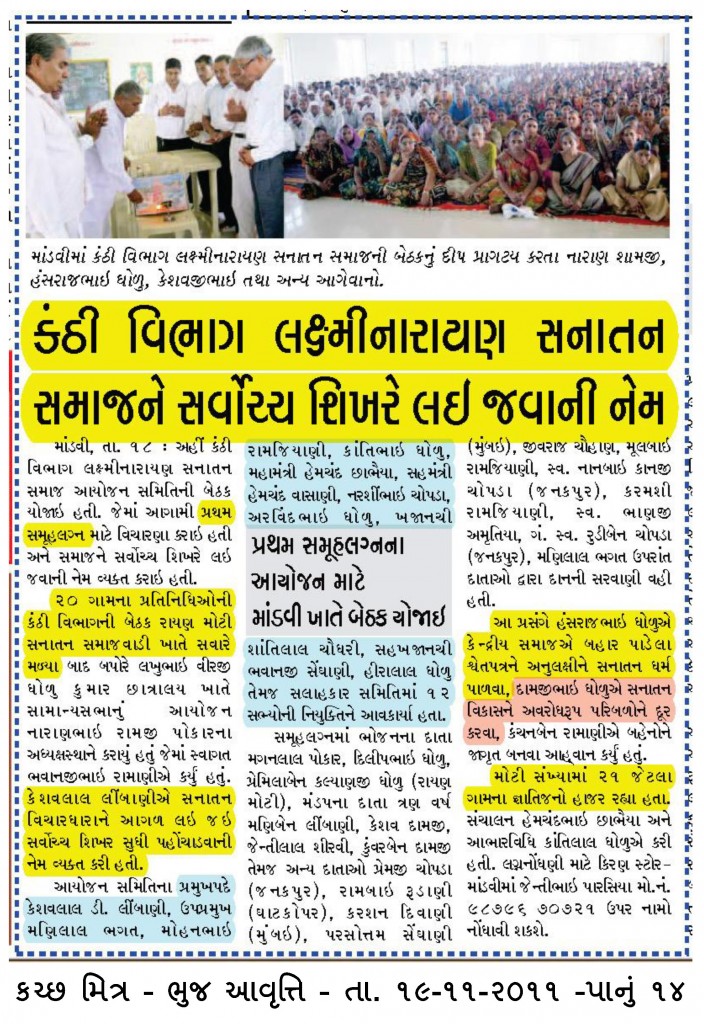 09-Nov-2011 || Jay Laxminarayan || || જય લક્ષ્મીનારાયણ || || Jay Sanatan Dharm || || સનાતન ધર્મની જય || આપણી સમાજ માટે આજનો દિવસ ઐતિહાસિક દિવસ છે. આવતા સમયમાં, એટલે ભવિષ્યમાં, નોંધ લેવા જેવું, બહુ મહત્વપૂર્ણ નિર્ણયો અને તે પ્રમાણેને પગલાં આજે લેવાયા છે. Today is a historical day. Today, very important decisions and accordingly steps, worth taking note in the future, were taken. માંડવી તાલુકાના આપણાજ ભાઈઓએ આજે ઐતિહાસિક કામ કર્યું છે. આજે માંડવી તાલુકામાં, સનાતની લોકોની પ્રચંડ હાજરી અને ગજબનો ઉમળકો જોવા મળ્યો. લોકોની ઉદારતા જોઈને ભલભલા લોકો અચંબા પડી ગયા. લોકોની હાજરી એટલી હતી કે, માંડવી હોસ્ટેલમાં બેસવાની જગ્યા પણ નહોતી. આપણા માંડવી તાલુકાના ભાઈઓએ આજે નવી “સનાતની” સમૂહ લગ્ન સમિતિ (“શ્રી કંઠી વિભાગ લક્ષ્મીનારાયણ પાટીદાર સનાતન સમાજ, માંડવી કચ્છ, સમૂહ લગ્ન આયોજન સમિતિ”) રચી છે. માંડવી તાલુકામાં, આગાઉ ચાલતી જૂની સમૂહ લગ્ન સમિતિ, જેમાં સતપંથી લોકો […]